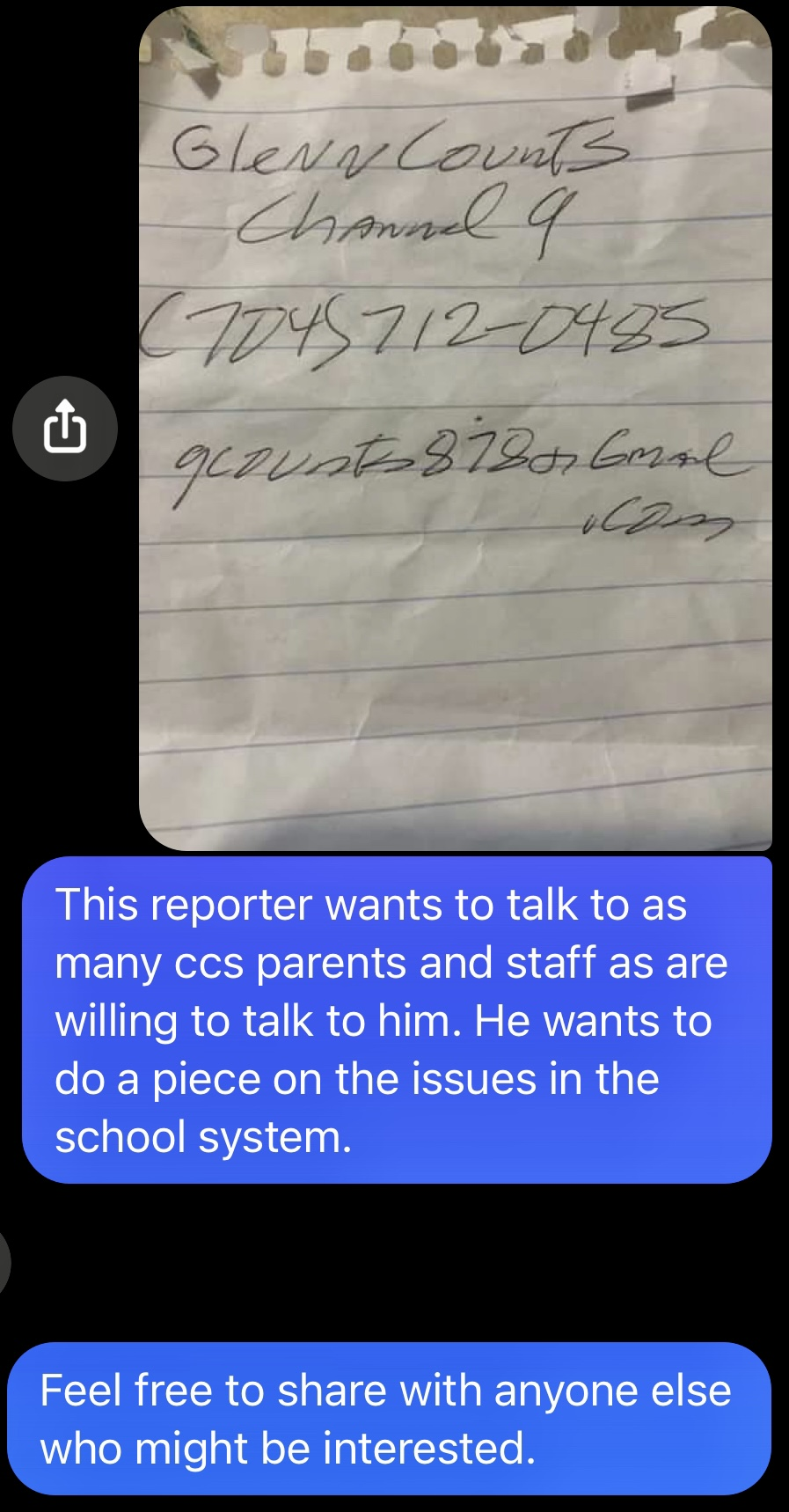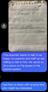 “This reporter wants to talk to as many CCS parents and staff as are willing to talk to him. He wants to do a piece on the issues at the school system.”