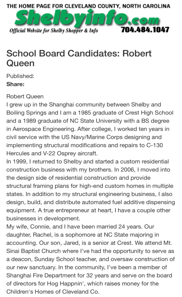 Folks, while School Board Chairman Robert “Luke” Queen and his “TINY” band of Rogue Republicans are down in the septic tank trying to dig up filth against anybody and everybody that opposes them, my newest source, Dinah – which means “Judgement” in Hebrew-dug up an old Campaign Advertisement for Robert Queen from back in 2020. Back when Luke still spoke the truth about Cleveland County Schools and their many problems. Robert Queen was on the right path back then. And that is why we elected him to the Cleveland County School Board in the 2020 Elections.