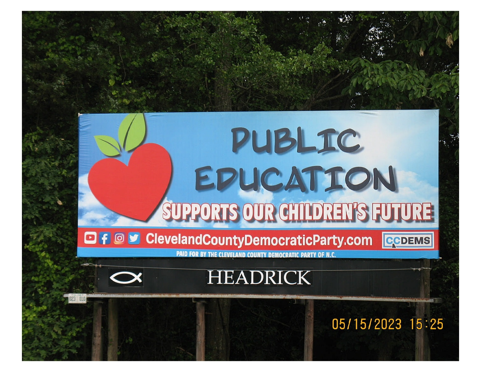 The Billboard states: “Public Education Supports Our Children’s Future,” “ClevelandCountyDemocratPary.com” and “Paid for by the Cleveland County Democrat Party of NC”, The Billboard meets all the requirements of the North Carolina Board of Elections for the 2024 Elections and is a clear indication that “somebody” is putting up big bucks for Democrat Candidates to recapture the majority on the Cleveland County School Board from the five Republican Seats held by Robert Queen, Ron Humphries, Joel Shores, Rodney Fitch and Greg Taylor in the 2024 Elections. And MORE.
