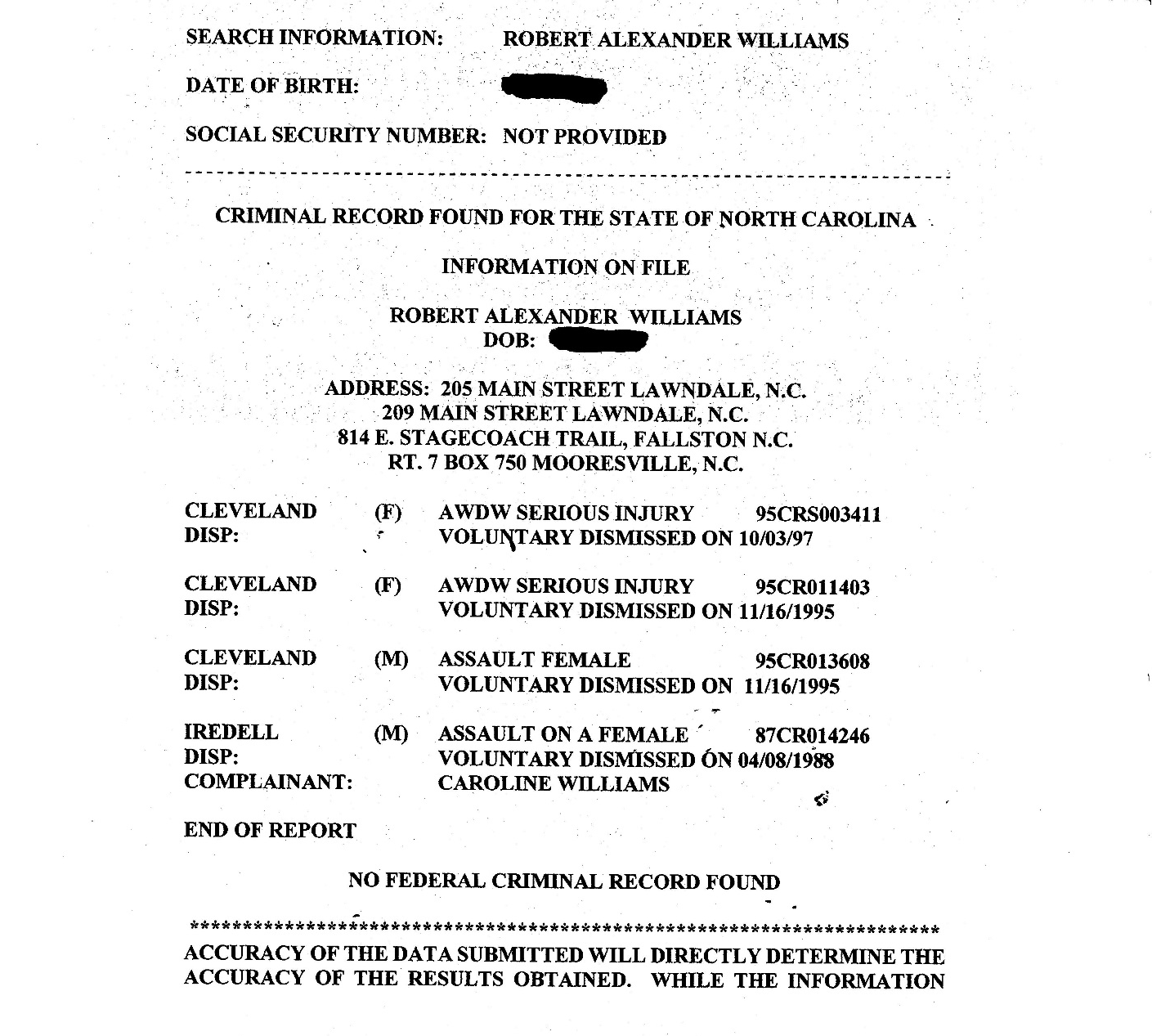 THIS anonymous letter was different! This time the letter contained a single page. Someone had gone down to the Courthouse and conducted a “Criminal Records Background Check” on Robert A and then sent that information to Robert A with no other statements or message. Apparently, SOMEBODY thinks that Robert A can be blackmailed by this information. That Robert A is scared or ashamed or something along those lines that this information might get out amongst the citizens and taxpayers of Cleveland County such that Robert A will cease and desist his political investigations and reports and cower-down like everybody else in Cleveland County.